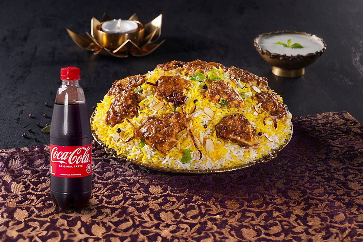 Enjoy a flavorful biryani with a refreshing beverage by your side.