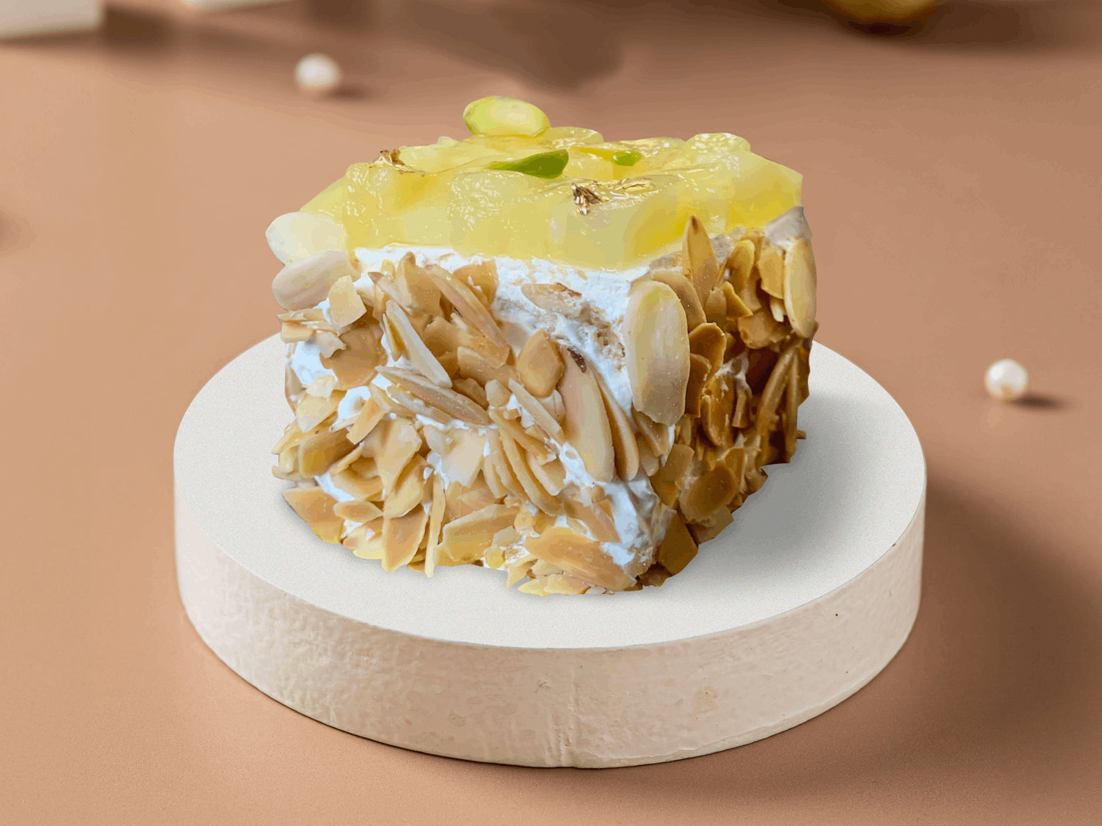 Yummy sponge cake with juicy pineapple slices and crunchy almonds on the edges f...Read More
