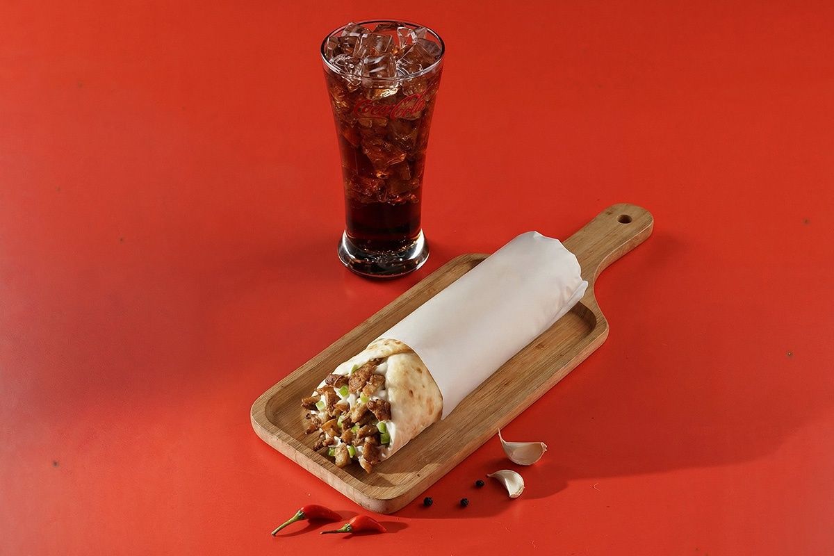 A flavour-packed shawarma with a chilled drink on the side. Bite, sip, repeat!