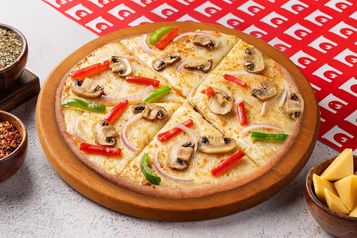 "A garden-fresh medley of mushrooms, tomatoes, onions, and capsicum on a crispy ...Read More
