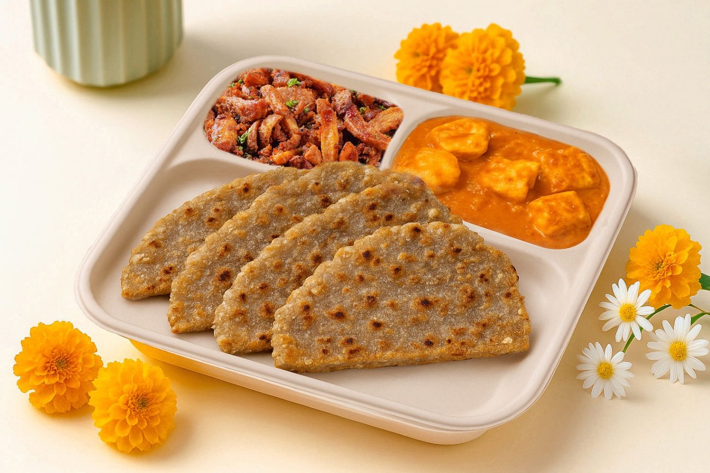 Sabudana Paratha with Paneer Makhmali and Masala Arbi