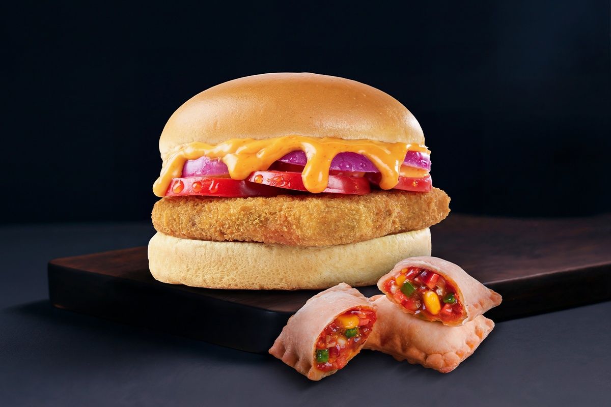 Crispy veg burger and pizza puff duo. Crunch squad assemble!